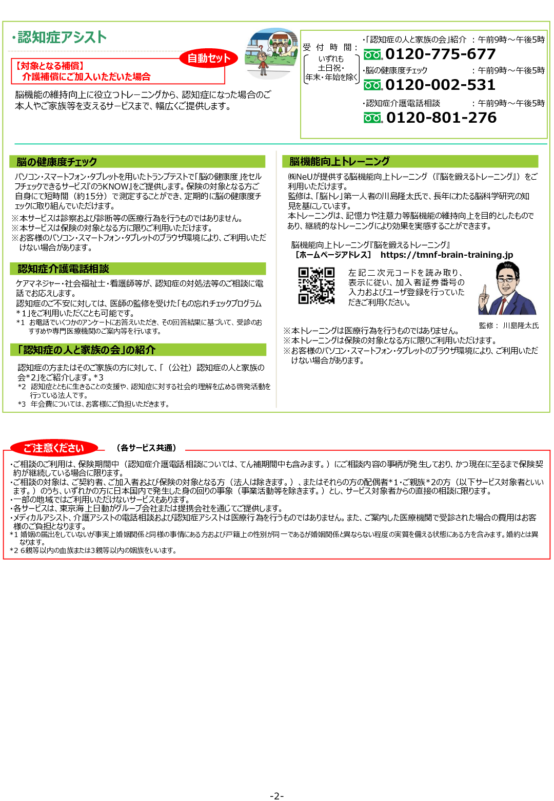 脳機能の維持向上に役立つトレーニングから、認知症になった場合のご本人やご家族等を支えるサービスまで、幅広くご提供します。